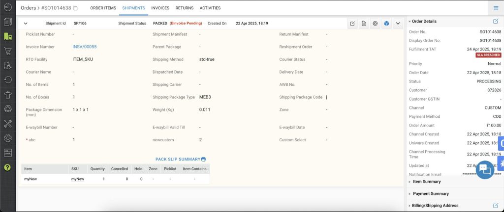 - For shipments where the invoice has been generated but the GST e-invoice is still pending, a flag “GST e-invoice pending” should be maintained at the shipping package level. In such cases, the shipment will remain in the PACKED state, and E-way bill generation should be restricted until the e-invoice is completed.