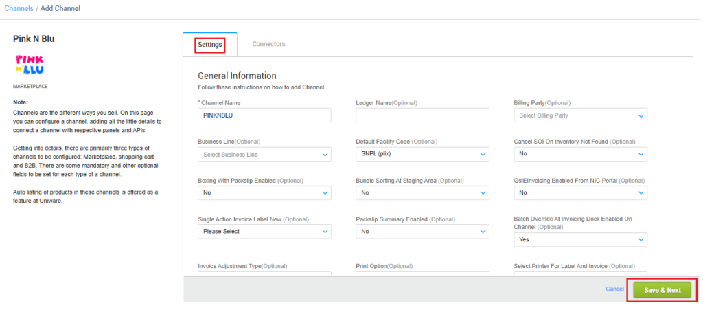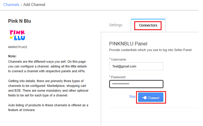The seller has to get credentials from the Pink N Blu channel team and use the same in the connectors page at the time of adding channel in Unicommerce.