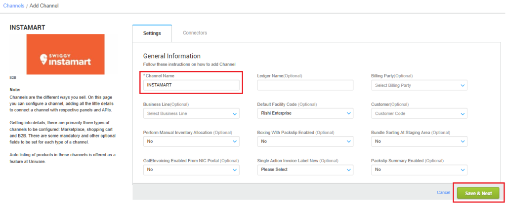 - Channel Name– Name of the channel added in Uniware for Swiggy Instamart.