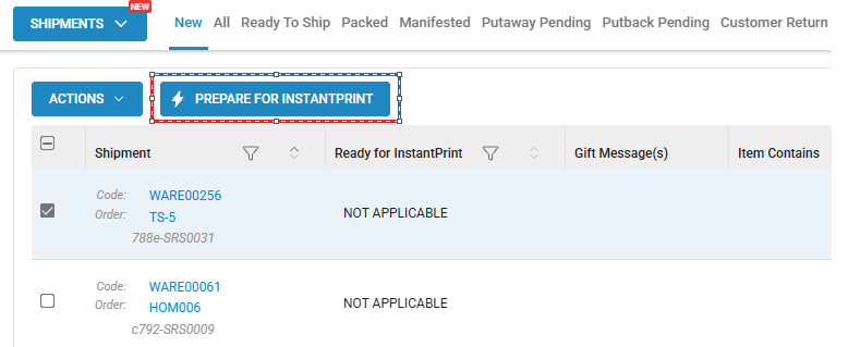 - Select the shipment (you can select single or multiple shipments), and click on the PREPARE FOR Instant Print button.