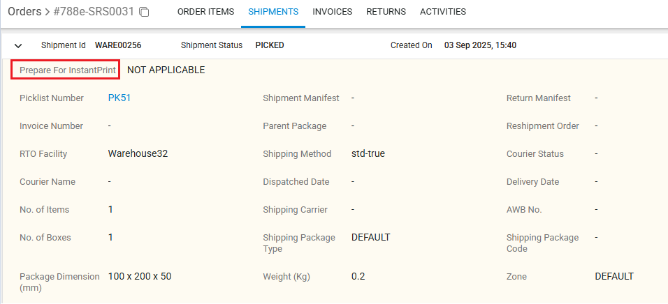Note: Shipments with a “NOT APPLICABLE” status cannot be processed for Instant Print (manual prefetch). This is because their channels have the prefetch setting disabled. - You can also view the Instant Print status on the individual shipment page under the “Prepare for Instant Print” field.